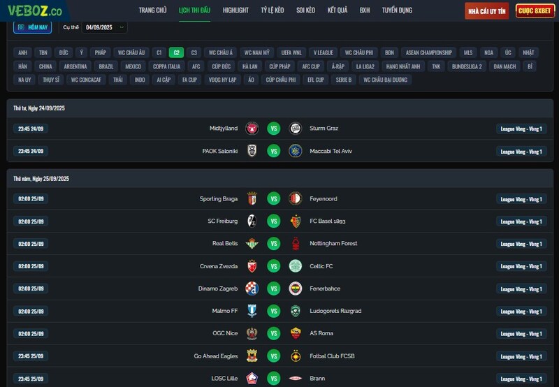 Tôi là fan Lyon, trong khi thằng bạn thân lại mê Roma, còn thằng kia thì cuồng Sevilla – “ông vua C2”. Mỗi đứa một đội, nên lúc xem lịch nếu không lọc thì rất rối. May mà Vebo có tính năng cá nhân hóa: chọn CLB mình thích, hệ thống sẽ lọc ra toàn bộ lịch thi đấu c2 của đội đó.