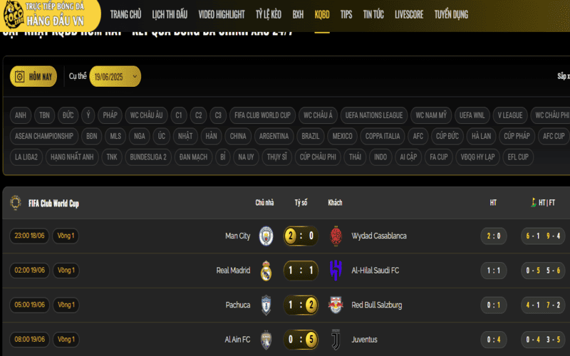 Thời gian thực: Cập nhật thời gian thi đấu đang diễn ra, phút thứ bao nhiêu của trận đấu.